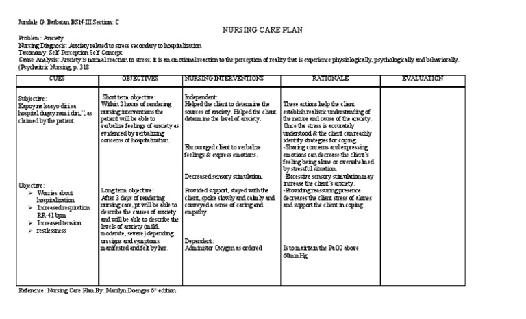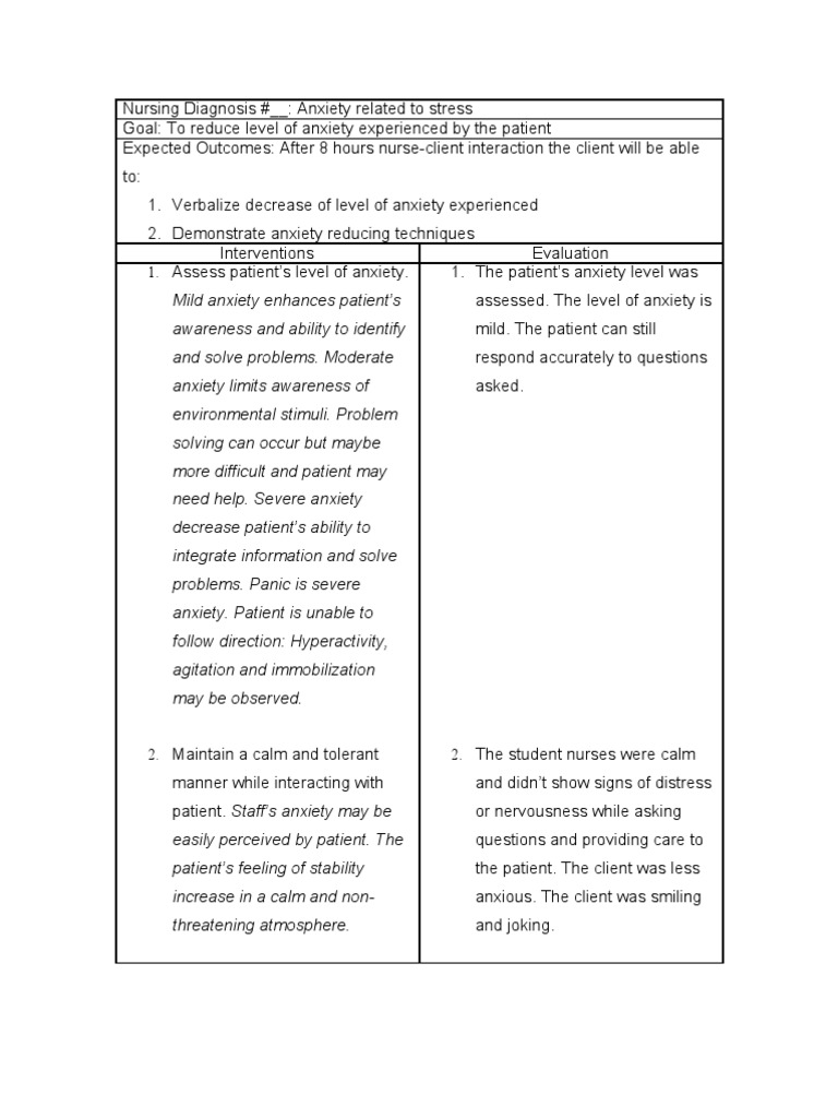 The formatting isn't always important, and care plan formatting may vary among different nursing schools or medical. Before treatment, the problem should be diagnosed so a physician can take further steps to cure it. The nurse or health care provider can transmit his or her own anxiety to the hypersensitive patient. Nursing plan care for anxiety. So i'm sure there's plenty of other things that they may have going plus, we are going to give you examples of nursing care plans for all the major body systems and some of the most common disease processes. Care plans also help to define the nurses' role in the patient's treatment and specific goals. This makes no sense being here. What are nursing care plans? Continue reading about postpartum anxiety: Anxiety is a type of an actual nursing diagnosis that is described as feelings of discomfort and apprehensions in response to the disturbance of the usual concept or pattern situation or environment. You can even modify some things such as letting them come at their most. A nursing care plan provides direction on the type of nursing care the individual/family/community may need. Remember that even the best care plan is useless unless the client also believes in the same goals.